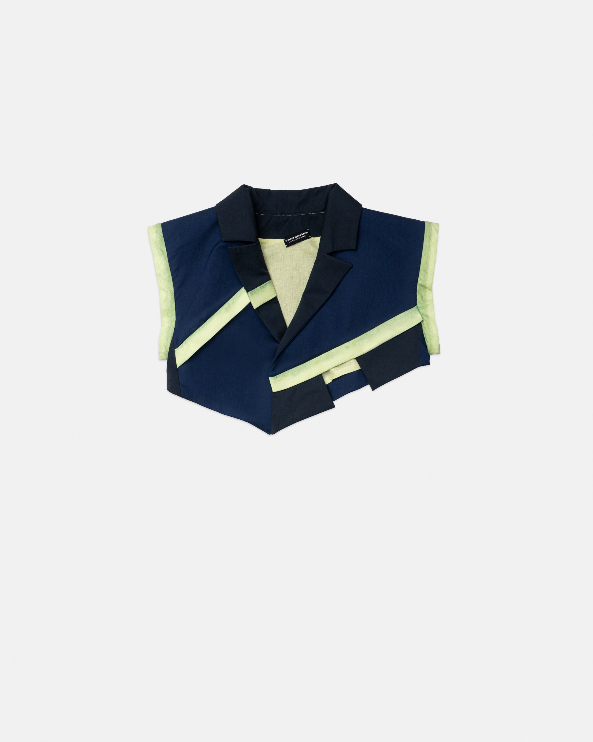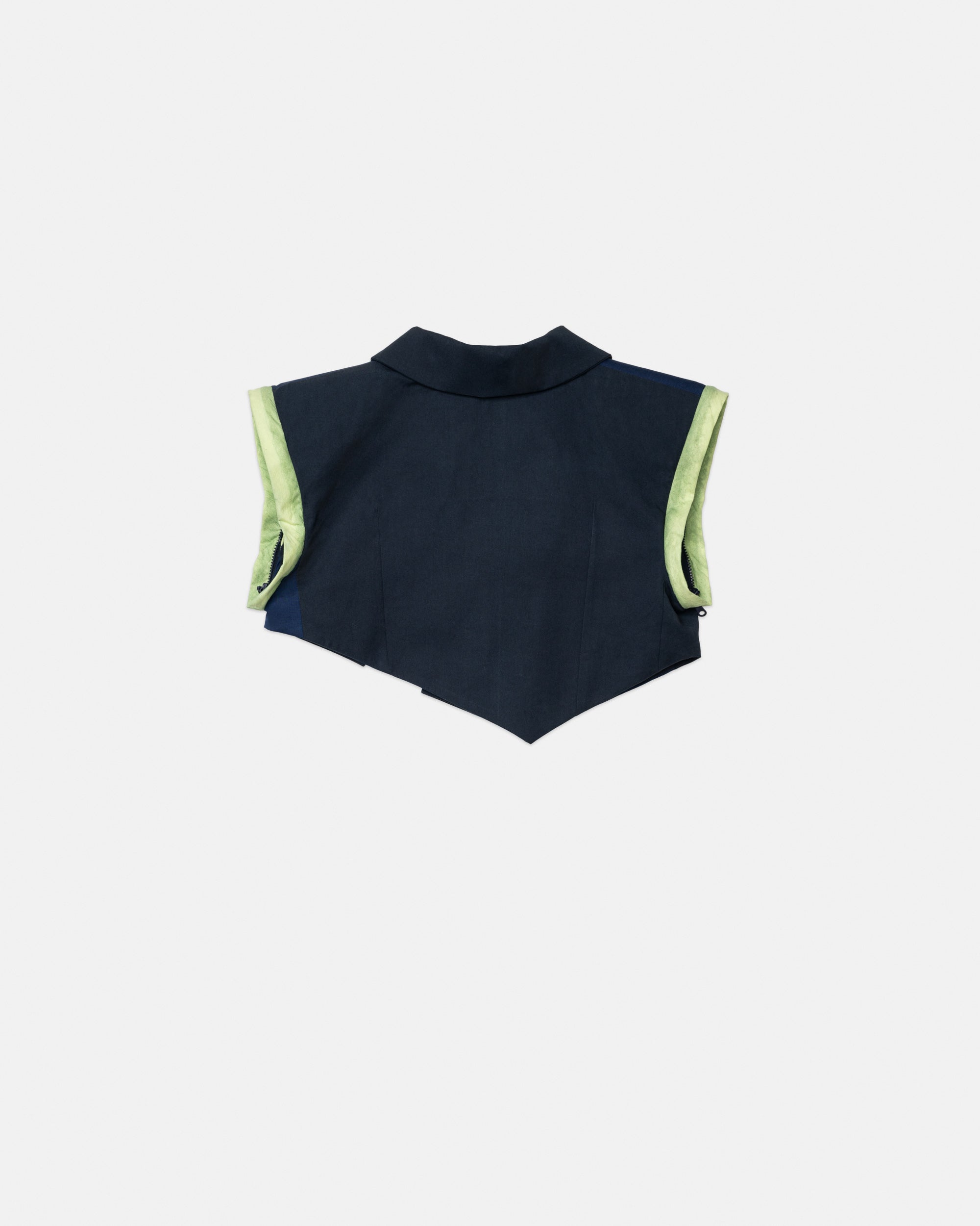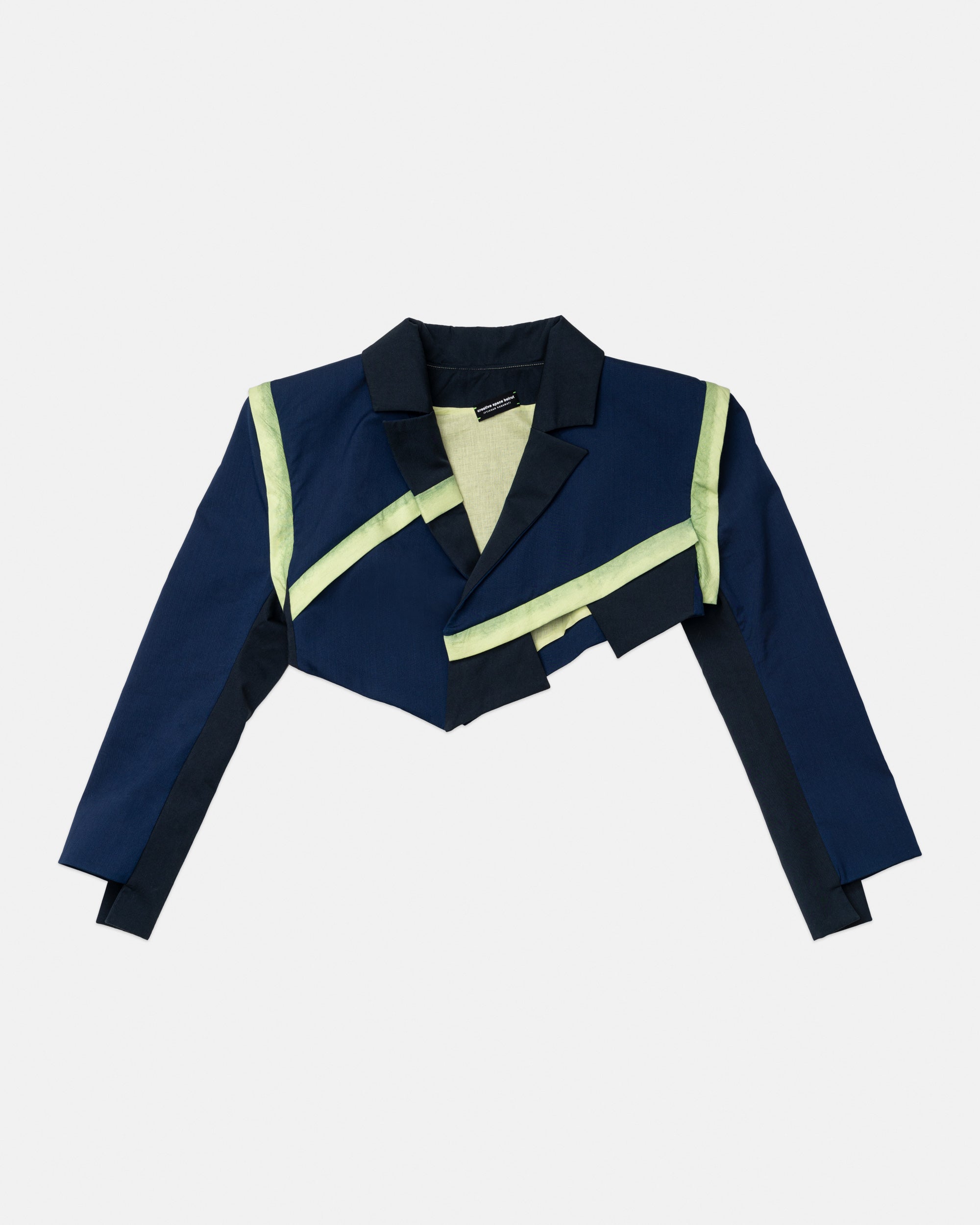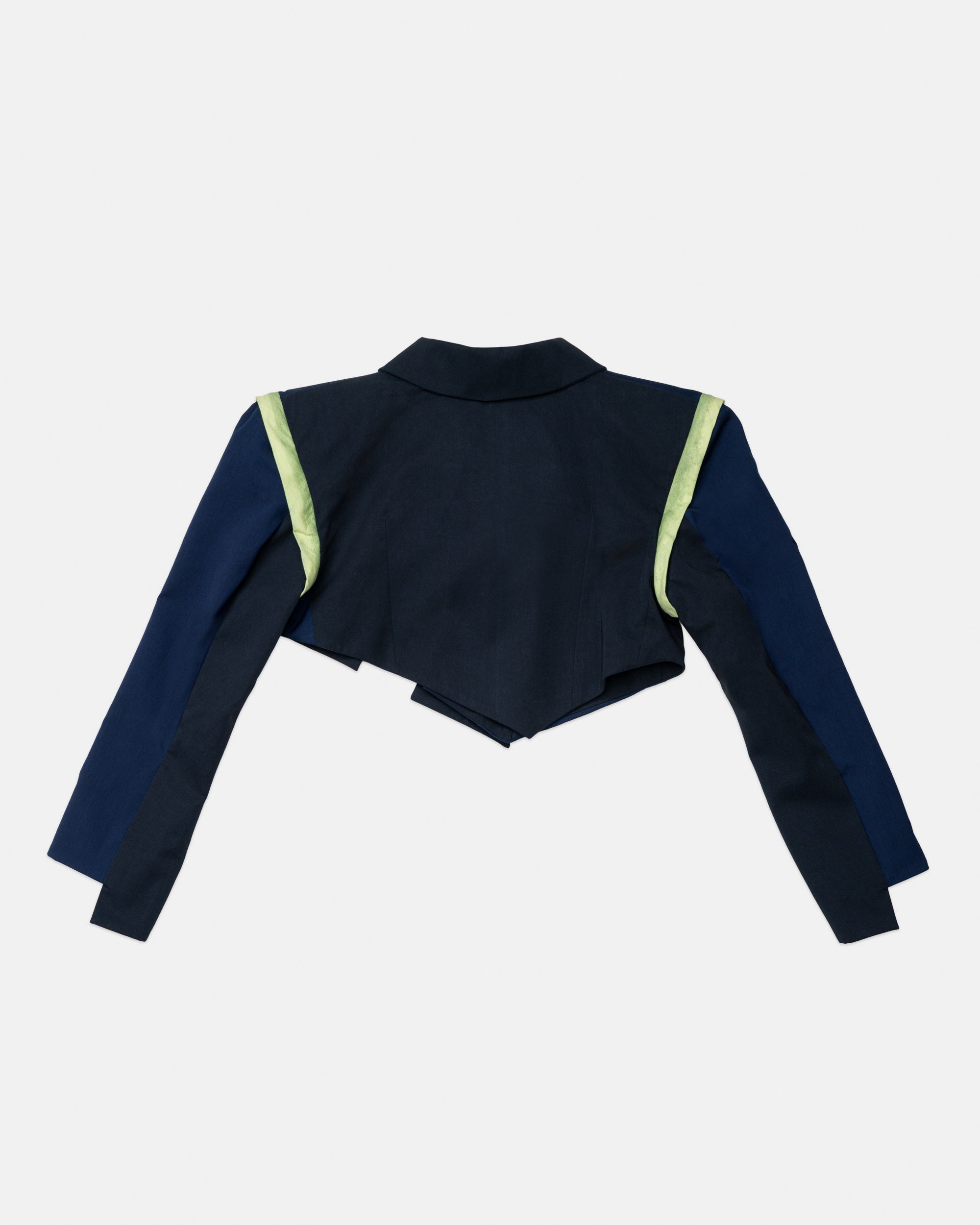 Asymmetrical hem puzzle detailed jacket with hidden zippers on armholes for removable sleeves, hidden pocket, and hand painted green poplin cuts for neon line effect.